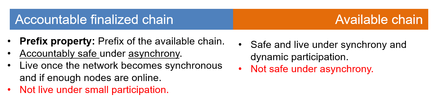 - Tiền tố của checkpoint cuối cùng tạo thành finalized chain. Tương đương với Finalized chain là prefix của available. Chuỗi này safe dưới mạng bất đồng bộ