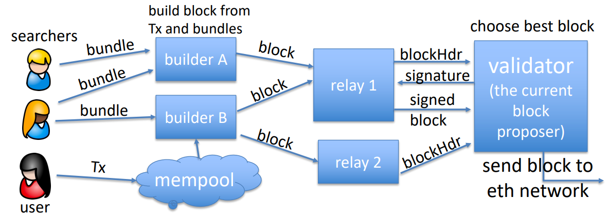 - Validator: có thể tự tạo Tx của họ với cách tương tự Tx của searchers nhưng người thụ hưởng sẽ là validator đó và đặt nó trước Tx của searchers.