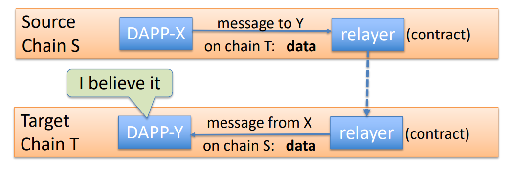 RelayerT chuyển msg cho người nhận khi các trustees đều kí ⟹ nếu DApp-Y tin trustees, thì sẽ biết được DApp-X gửi msg.